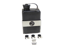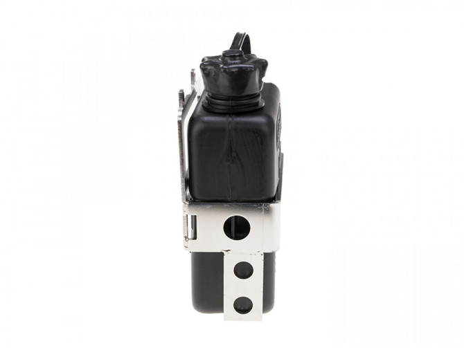 Spezial Gepäckträger Jerrycan Halter mit einem 1 Liter FuelFriend Jerrycan in Schwarz. Passgenau für die linker oder rechter Seite an einer Puch Maxi N / K, aber auch universell einsetzbar.