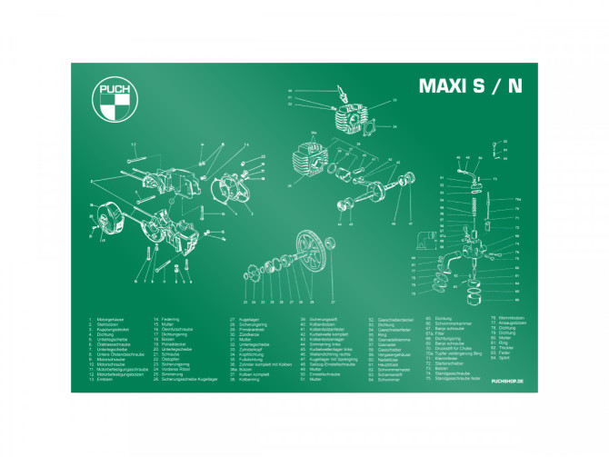 Die Abbildung zeigt die Explosionszeichnung der wichtigsten Teile eines Maxi S oder N Motors. Praktisch und schön zugleich!