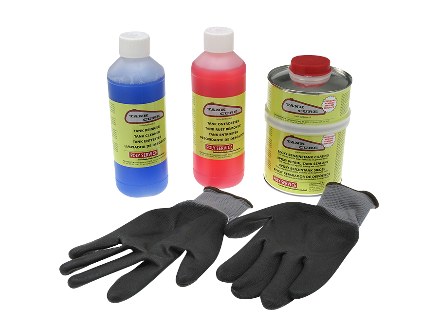 Als erstes entfetten sie den Tank mit Tank Cure Entfetter, Dann entrosten Sie den Tank mit Tank Cure Entroster. Bei starker Verrostung geben Sie kleine Kieselsteine oder kleine Spax- Schrauben zu dem Entfetter und Entroster. Bitte beachten Sie unsere Gebrauchsanweisung.