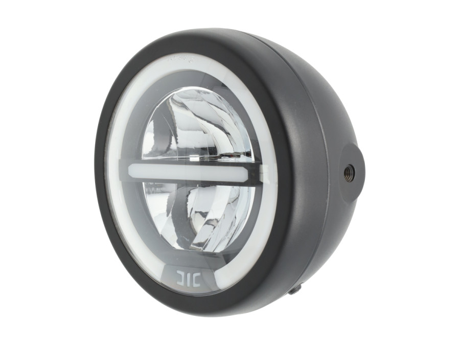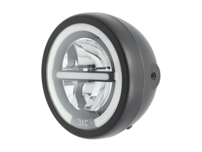 Moderner custom LED-Scheinwerfer für Puch mit Angel Eye Standlicht. Je nach Anschluss weißes oder gelbes LED-Licht. Robustes schwarzes Metallgehäuse und starke Lichtleistung.