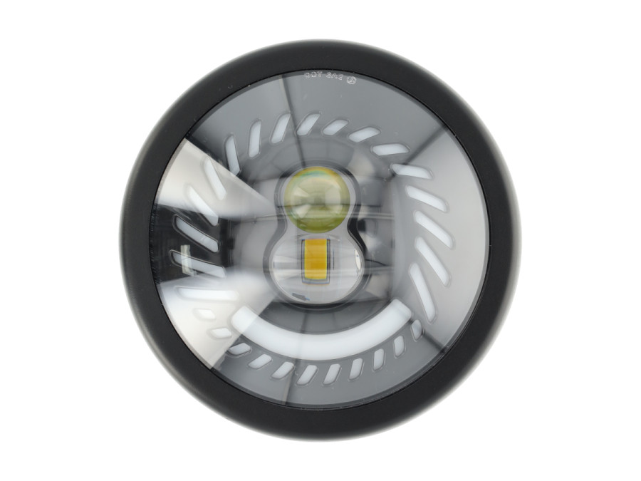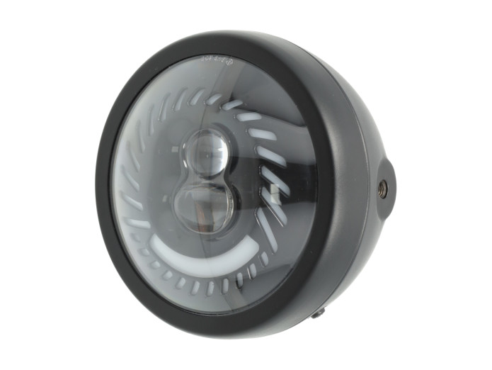 Moderner custom LED-Scheinwerfer für Puch / Mofa mit Angel Eye Vortex Standlicht. Je nach Anschluss weißes oder gelbes LED-Licht. Robustes schwarzes Metallgehäuse und starke Lichtleistung.