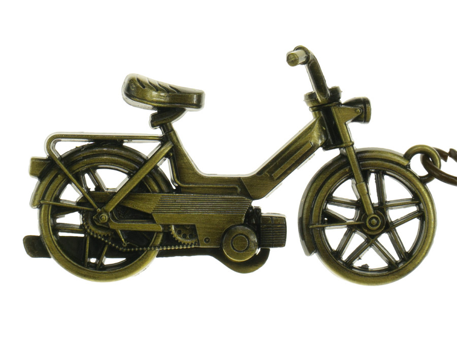 Cooler Vintage-Schlüsselanhänger in Form eines Miniatur-Mopeds von Puch Maxi N. Offensichtlich schön an deinem Schlüsselbund! Der Schlüsselring ist aus robustem, goldfarbenem Metall gefertigt.