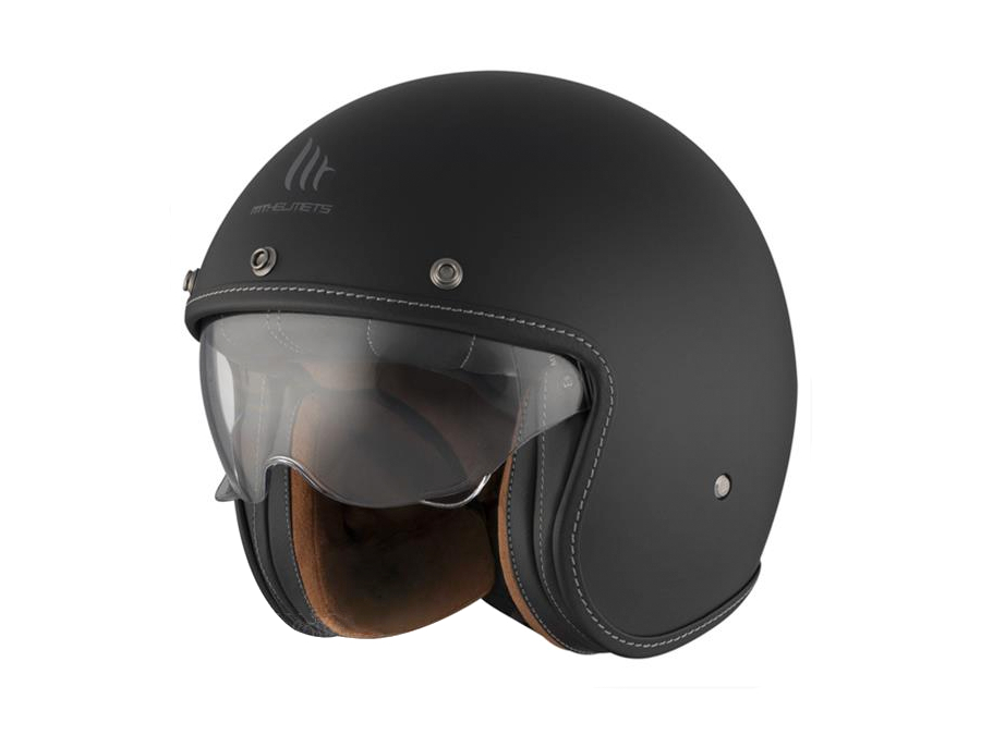 This classic retro jet helmet LE MANS II SV S is available in 3 colours: white, gloss black and matt black. The helmet has an integrated sun visor and very nice and high-quality inner lining and is available from XS to XXL. These helmets can also be expanded with a separate helmet visor, leather strip on top and matching custom glasses.