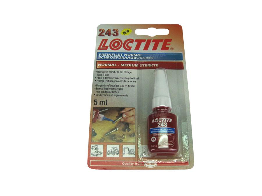 - Loctite 243 heeft een Medium Sterkte en zit verpakt in een 5ml flacon. Het Loctite 243 Borgmiddel is dankzij de gemiddelde sterkte en viscositeit, ideaal geschikt voor algemeen gebruik en het borgen van alle metalen schroefdraadverbindingen. Met het Loctite 243 Schroefdraadborgmiddel zet je bouten, moeren en tapeinden vast en dicht ze af om het loskomen door trillingen te voorkomen.