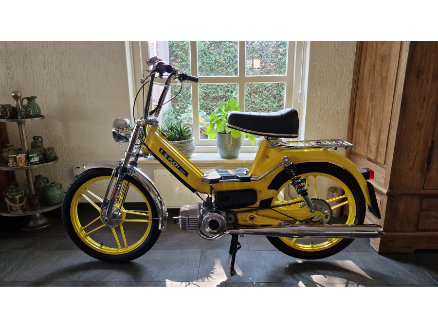 Puch Maxi met E50 kickstarter blok is chemisch ontlakt, geneutraliseerd,gestraald en gepoedercoat in verkeersgeel RAL 1023 met blanke finish door Sublicoat BV uit Hengelo (Ov.)