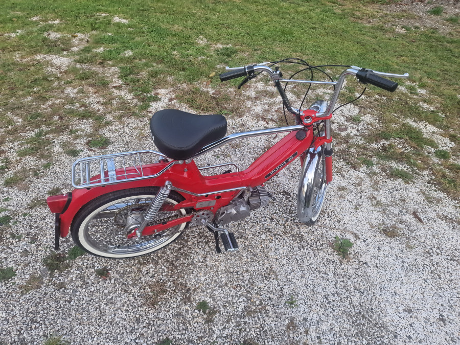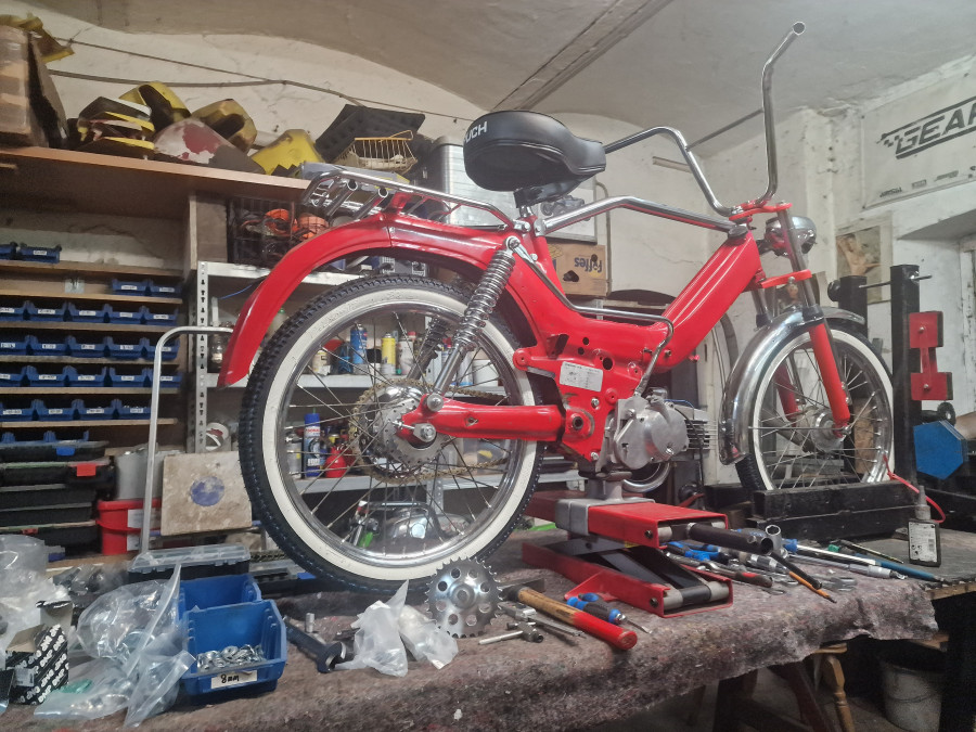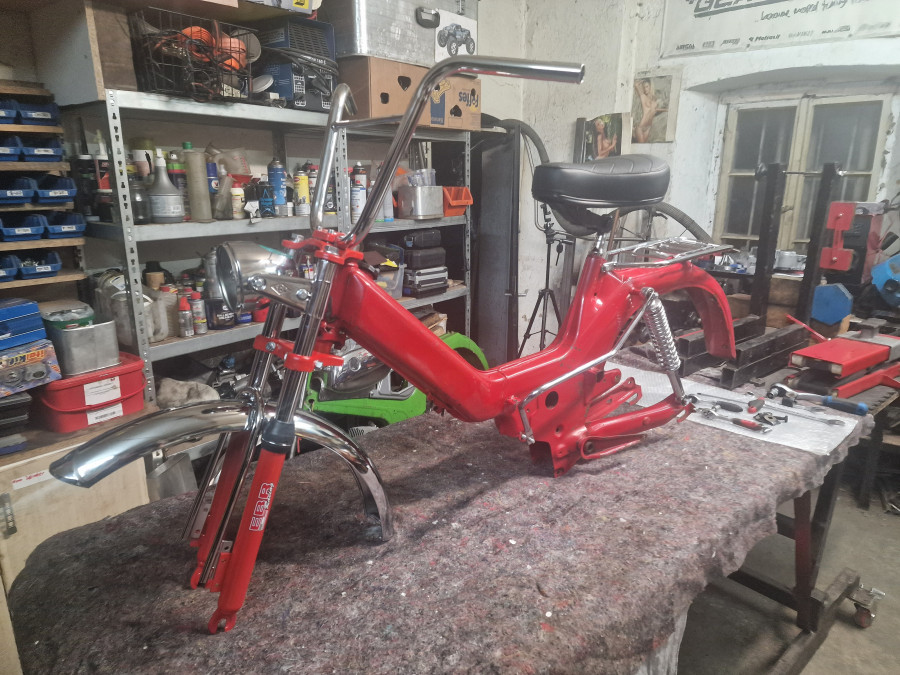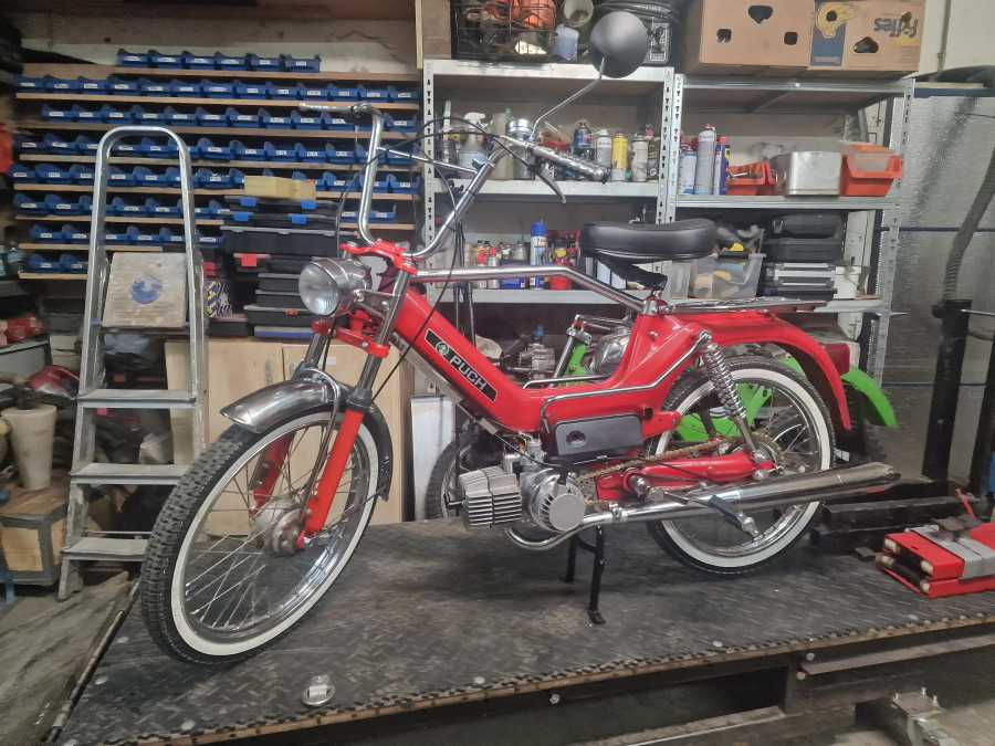 Puch Maxi mit 50ccm E50 Motor . Rahmenstrebe von einem Peugoet Moped . EBR Gabel . WW- Reifen 2.25x17 . 15mm Vergaser .