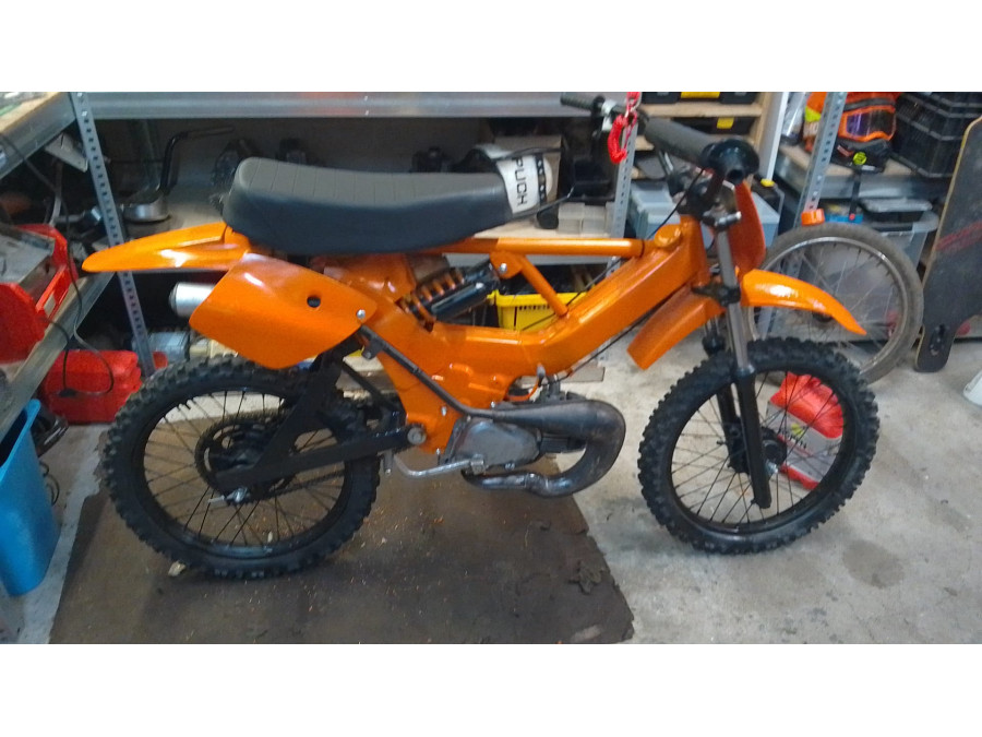 Custom achter brug kawasaki shock voorvork is Honda mt. Proma cc bovenlangs gemaakt poort getuned carters uit gedremeld 4 gelagerd blok. De binnenkant van de tank was helemaal veroest en het frame is gezandstraalt en opnieuw gespoten met een mooie ktm oranje en de rest zwart. Is een leuk projectje.
