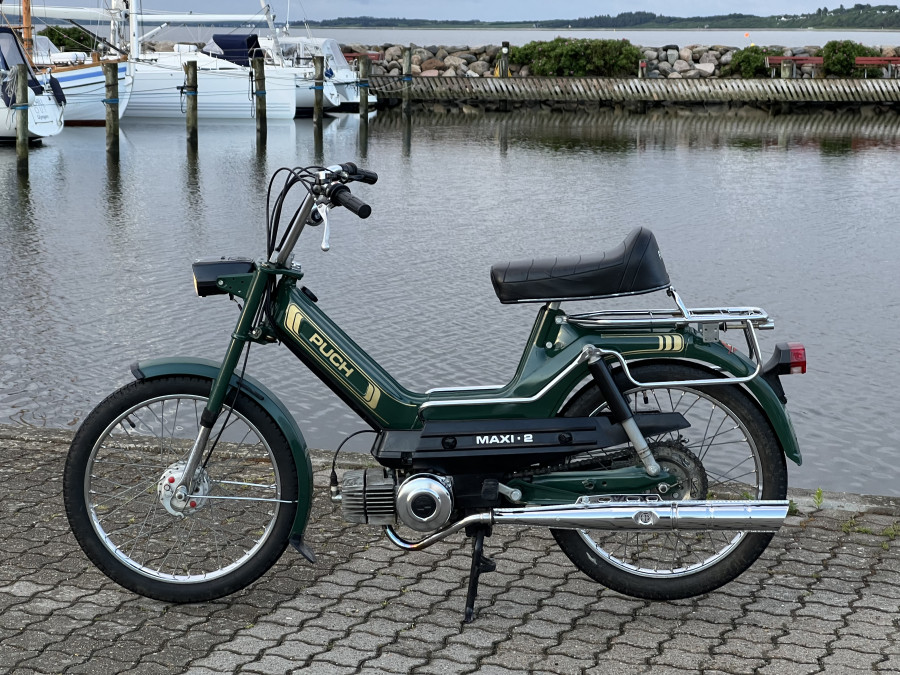 Nearly original Puch Maxi 2 from 1984, the exhaust is a new reproduced part. Everything else is original, including the paint. In Danmark there is very strict laws about mopeds, so it runs about 35 km/h.