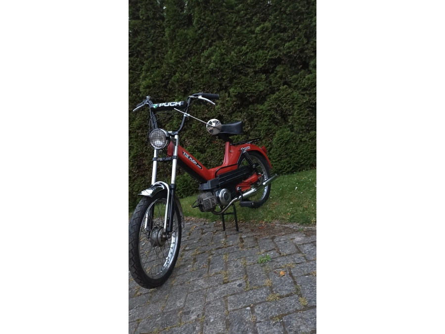 Puch Maxi S aus den Niederlanden in Rot mit Chromen und Schwarzen Akzente.