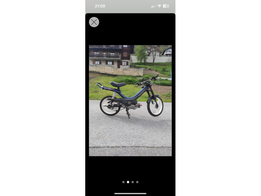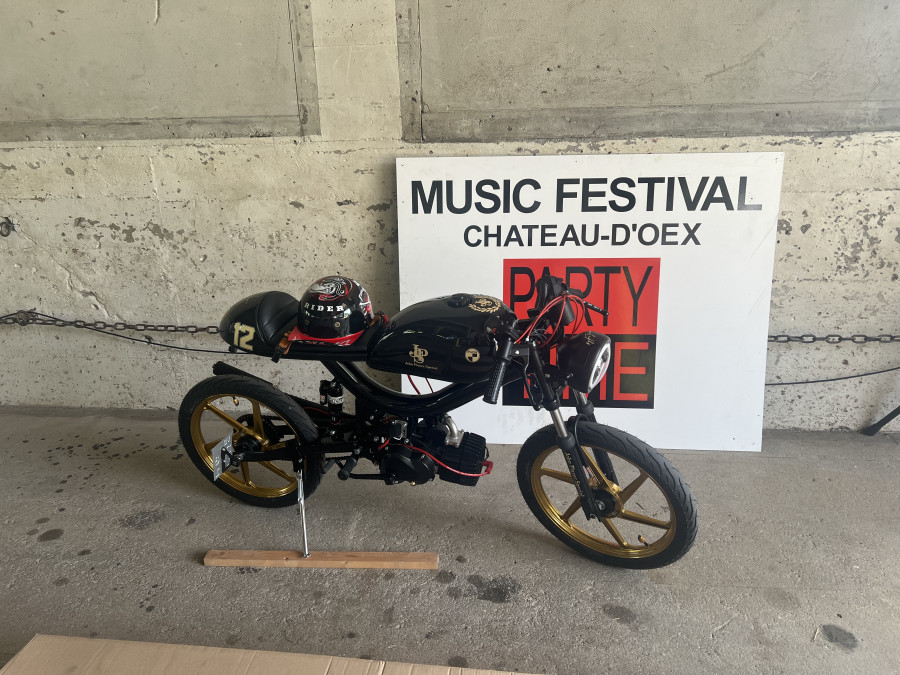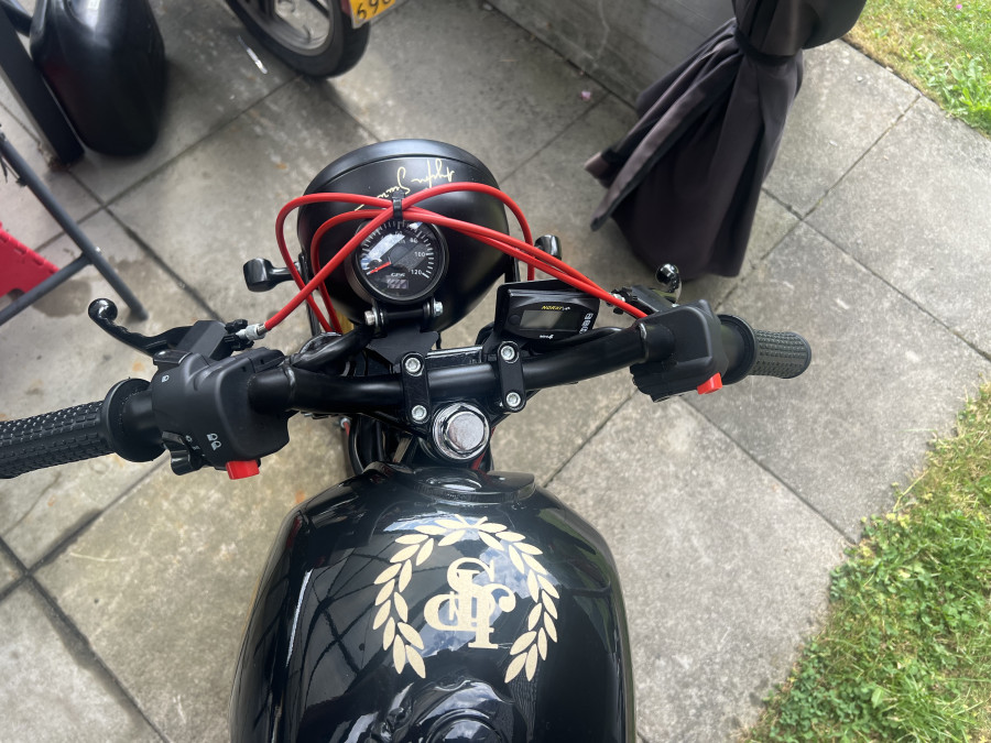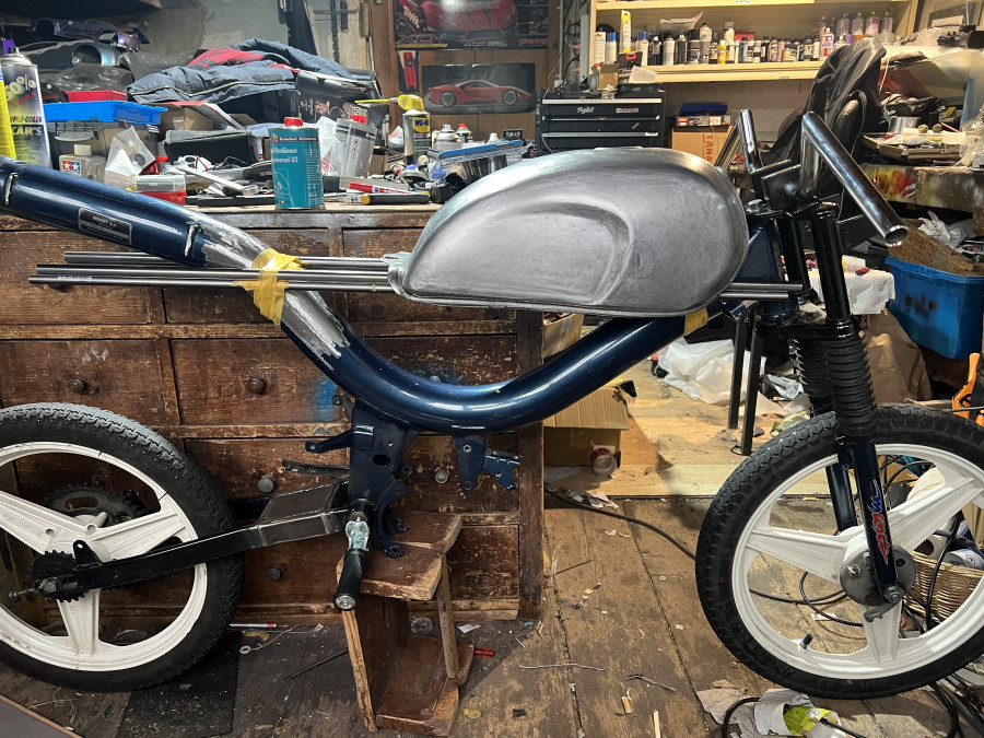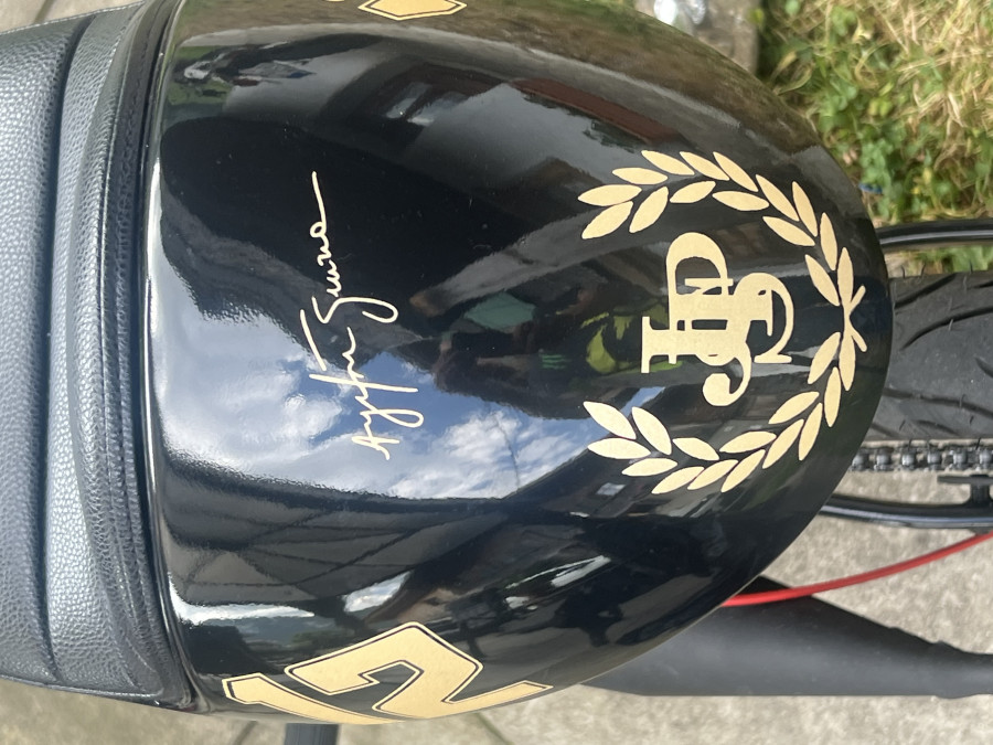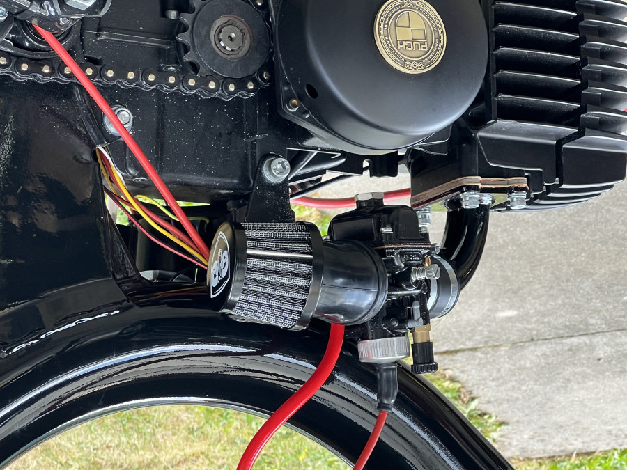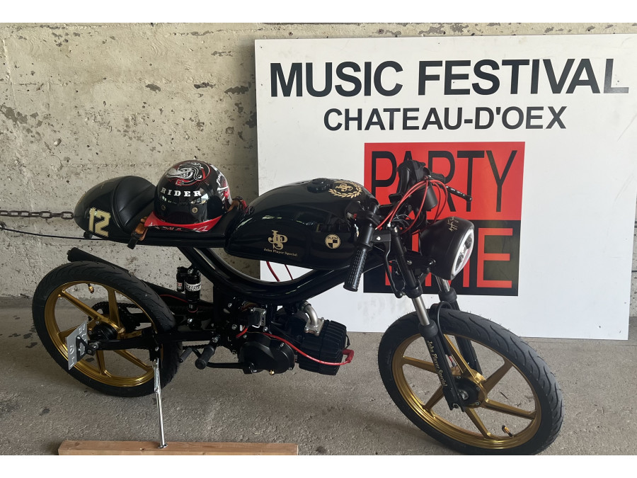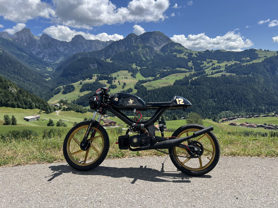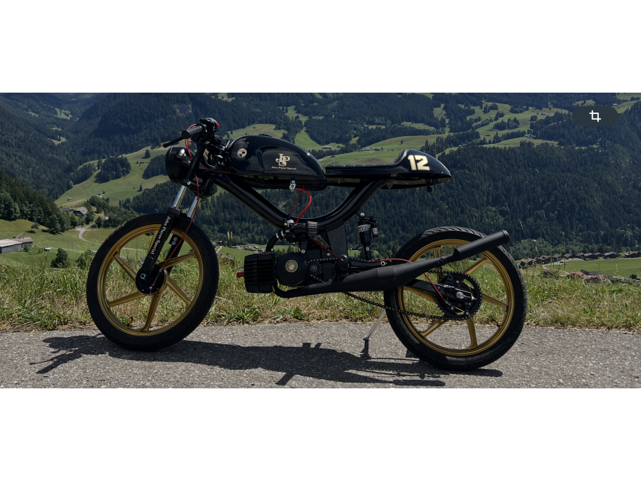 Umwandlung des Puch Manet in einen Café Racer. Hommage an Ayrton Senna. Kickstarter. Schwinge 10 cm verlängert. Rock Shock Stoßdämpfer.