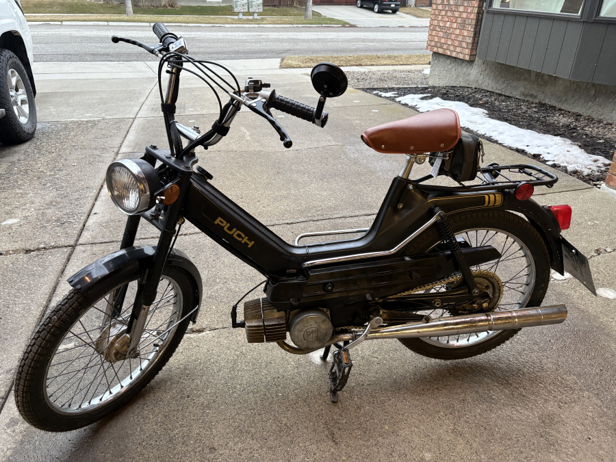 Found abandoned on a farm in British Columbia, Canada and brought back to Calgary, Alberta for restoration. Resurrected with parts from Puch Shop, it’s now back to its original glory. Currently all stock but will be looking at a top end upgrade and a 12v conversion in the near future.