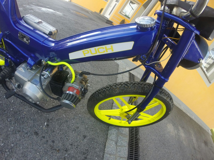 Ich und mein Vater dachten uns das wir unser altes Puch Maxi umbauen. Wir nahmen mein altes Quad her und bauten den Motor aus der auch einen Rückwerts Gang besitz und E-Starter. Wir schweißten und schliffte sehr viel wir mussten einen Teil vom Tank heraus nehmen. An dem ganzen Projekt brauchten wir ca. 2 Monate. Es fährt sich sehr gut und man kann leicht wheeles machen da wir eine große Übersetzung einbauten.